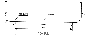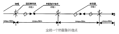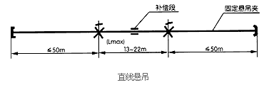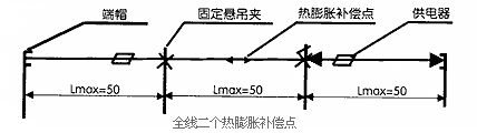 補(bǔ)償段確定:總長度超過100m的供電安全滑觸線,考慮到整條管路的熱膨脹變化,采用固定懸吊與浮動(dòng)懸吊兩種方式:兩固定懸吊之間,稱為補(bǔ)償段,根據(jù)全年溫差,確定補(bǔ)償兩側(cè)固定懸吊的Z大間距Lmax,一般不少于12cm,固定懸吊配置見下圖: