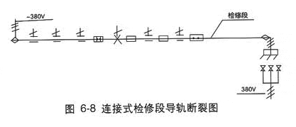 (五)檢修段 1、原理和功能:當(dāng)起重設(shè)備進(jìn)入檢修段時(shí),輸電導(dǎo)管工作段仍能通電工作,檢修段和工作段采取分別供電要求相位一致,兩段連接處采用絕緣隔離,當(dāng)需檢修起重機(jī)進(jìn)入檢修后,即可切斷檢修段電源(圖6-8)