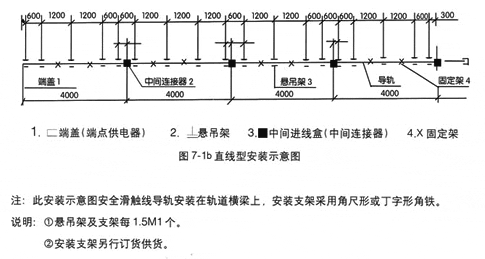 (一)安裝位置選擇 1、安裝位置盡可能靠近移動(dòng)受電設(shè)施同一側(cè) 2、安裝位置盡可能避開高溫?zé)嵩矗瑥?qiáng)光照射及其紅、紫外線輻射。 3、應(yīng)保證不受物體撞擊和便于日后維修 (二)支架安裝方式的確定 可由廠方提供安裝方式預(yù)約訂做。 (三)安裝前的準(zhǔn)備工作 1、根據(jù)地形和廠方要求繪制安裝示意圖。無特殊情況可按下圖進(jìn)行準(zhǔn)備工作。 2、支架裝配,直線導(dǎo)管每根長4m,支架的懸吊間距按下圖進(jìn)行安裝,亦可根據(jù)現(xiàn)場環(huán)境條件增減支架的間距。支架必須牢固且排列整齊美觀。 3、安裝檢查 (1)檢查導(dǎo)管外有無破裂、扭曲變形,導(dǎo)管內(nèi)導(dǎo)軌接頭是否平直光滑。 (2)導(dǎo)電器應(yīng)靈活自如的通過導(dǎo)管。 (3)導(dǎo)電器內(nèi)電刷應(yīng)伸縮自如,完整無缺、且有一定彈性。