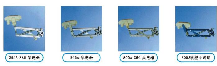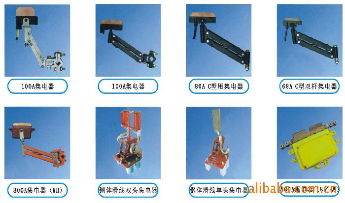 單極集電器、200A 360集電器、500A集電器、500A 360集電器、500A噴塑不銹鋼、1250A集電器、1600A集電器、500A單臂式集電器、2000A集電器、100A集電器、80A C型集電器、68A C型雙桿集電器、800A集電器WH、鋼體滑線雙頭集電器、鋼體滑線單頭集電器、500A集電器8字型。單極滑觸線集電器
